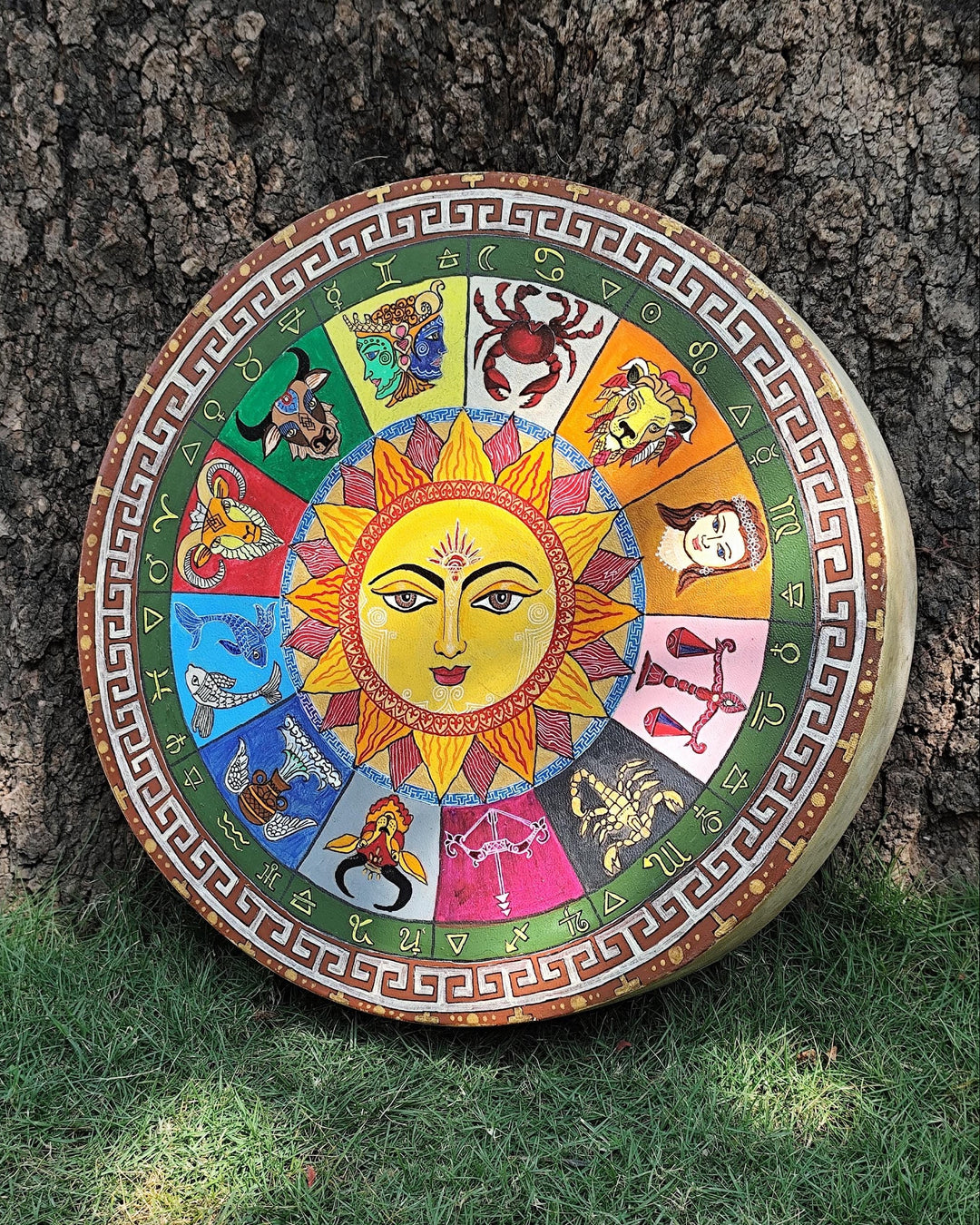 Every drum in this collection is hand stretched and hand painted, making each piece completely unique. The artwork is intuitively inspired by celestial energies, zodiac wisdom, solar symbolism, and sacred geometry. These symbols are believed to hold energetic significance, supporting alignment, grounding, and inner awareness.
