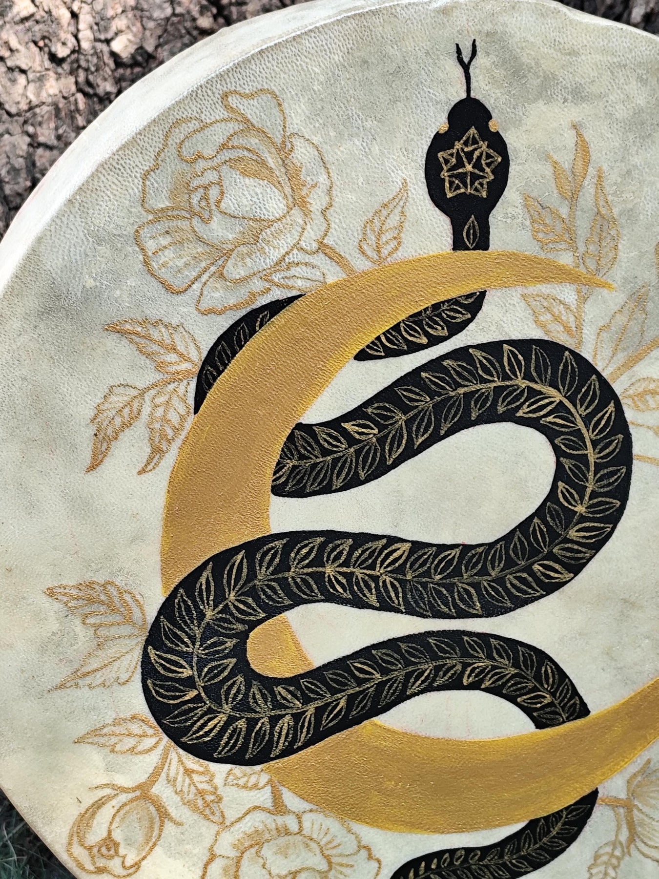 This hand painted Serpent and Crescent Moon Medicine Drum is a powerful ceremonial instrument created for sound healing, ritual, and spiritual transformation. Featuring a coiled black serpent intertwined with a golden crescent moon and delicate floral detailing, this drum carries deep symbolism of rebirth, intuition, and lunar wisdom.