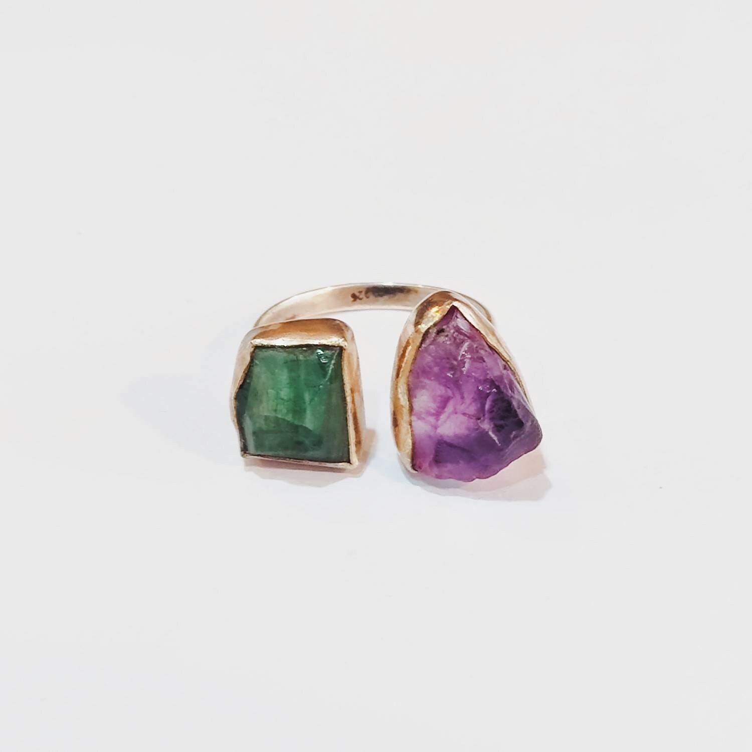 Our Green Emerald and Amethyst Stone Crystal Ring is an exquisite embodiment of nature's treasures and artisan craftsmanship.