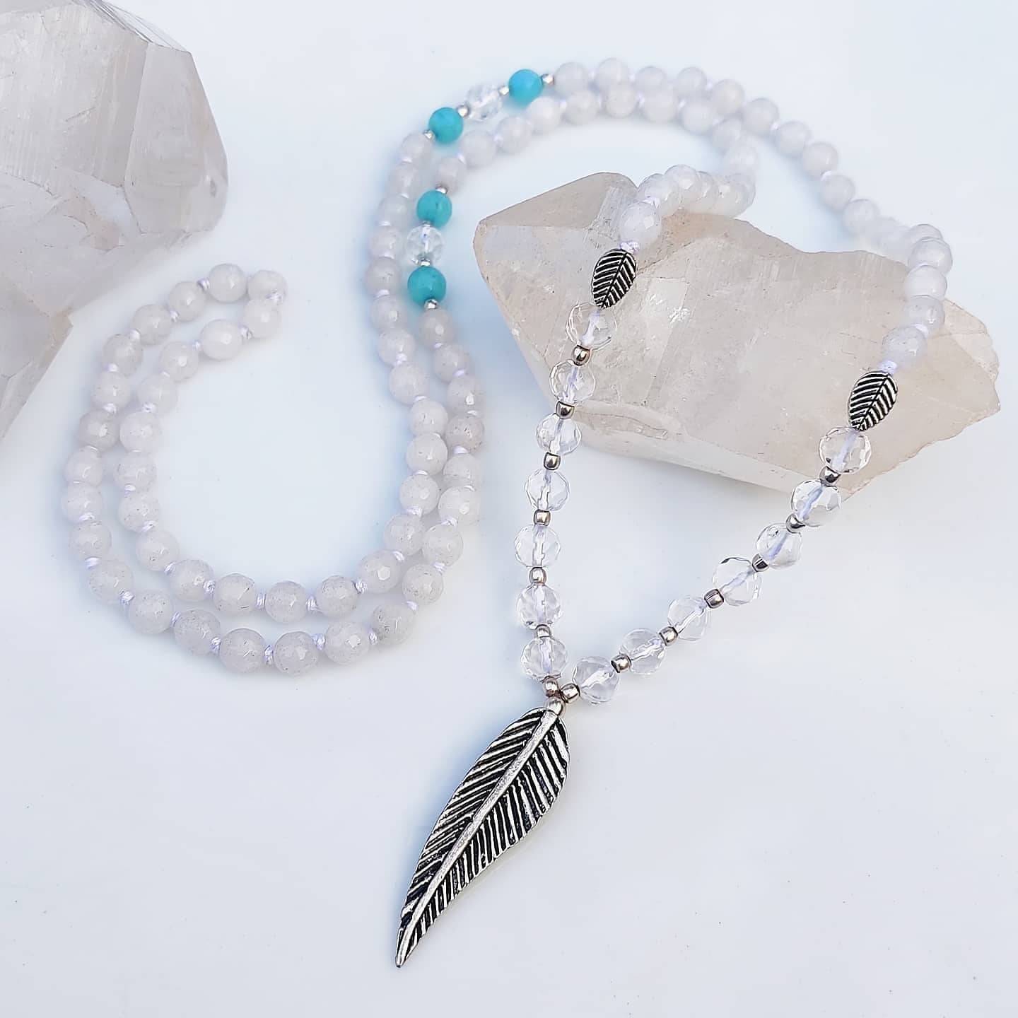 • Spiritual jewelry set for growth and connection: bead feather mala necklace + Elephant OM bracelet.